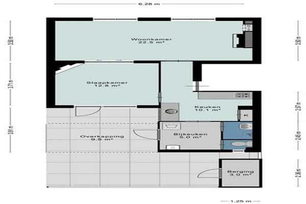 Half open keuken (circa 10,1 m²) met tegelvloer en twee recht opgestelde, nette keukeninrichting voorzien van kunststof werkblad, RVS spoelbak, 4-pits gaskookplaat, afzuigkap en praktische inbouwkast.