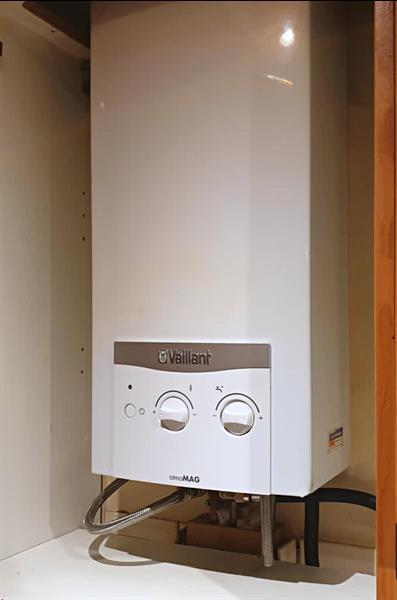 De badmaker heeft een douche, fonteintje, een toilet en een elektrische verwarmingsplaat.