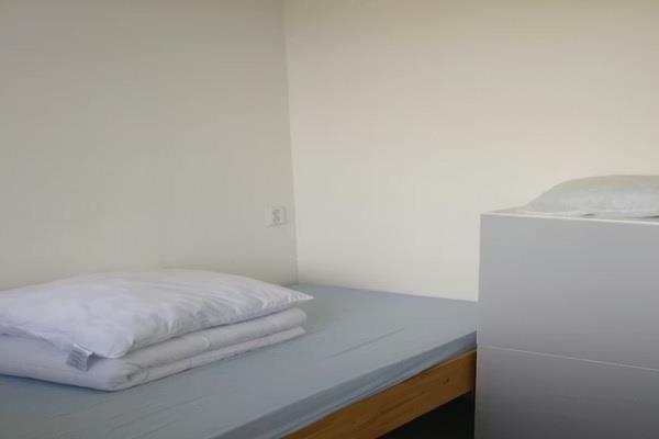 Deze kamer is een van de kleinste kamers in het appartement, heeft een groot raam en is voorzien van basismeubilair (bed, tafel met stoel en een kledingkast). Deze kamer is in totaal 6 m².