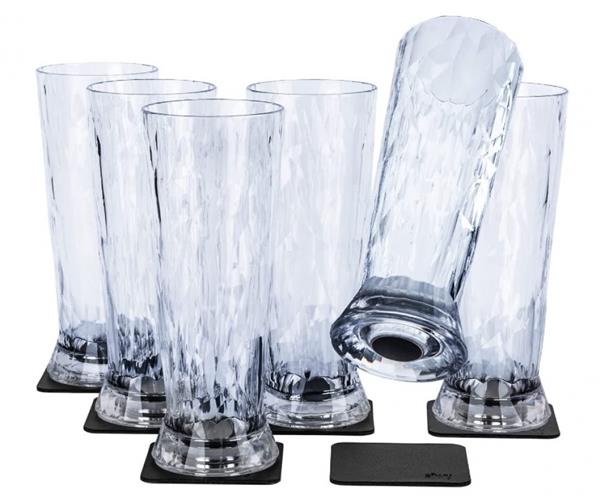 De magneet aan de onderkant van het glas hecht zich aan de bijgeleverde metalen Nano-Gel onderzetters of pads.